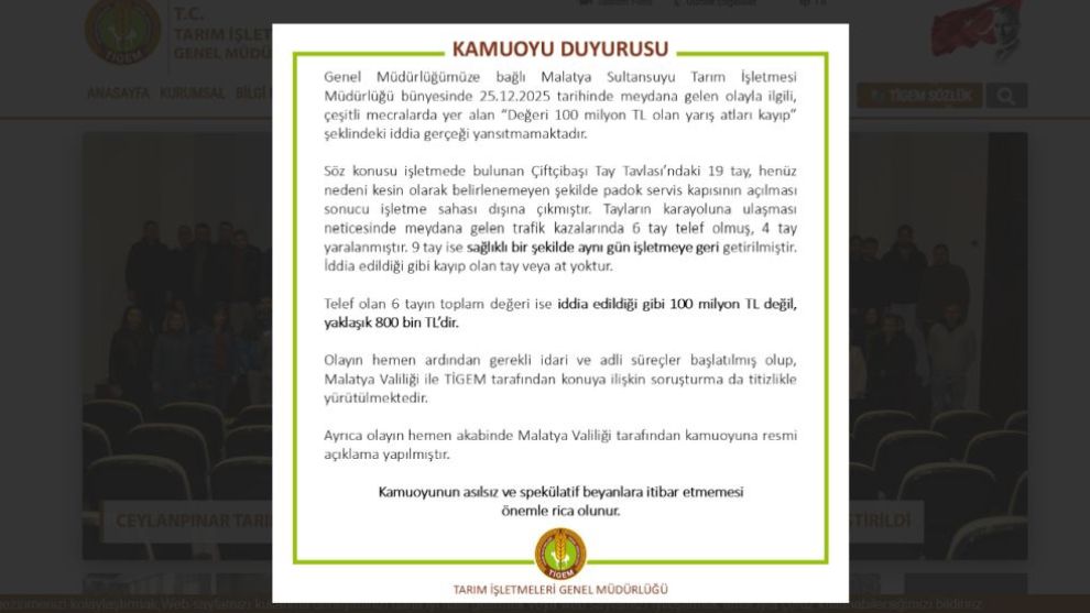 "Genel Müdürlüğümüze bağlı Malatya Sultansuyu Tarım İşletmesi Müdürlüğü bünyesinde 25.12.2025 tarihinde meydana gelen olayla ilgili, çeşitli mecralarda yer alan ‘Değeri 100 milyon TL olan yarış atları kayıp’ şeklindeki iddia gerçeği yansıtmamaktadır. Söz konusu işletmede bulunan Çiftçibaşı Tay Tavlası’ndaki 19 tay, henüz nedeni kesin olarak belirlenemeyen şekilde padok servis kapısının açılması sonucu işletme sahası dışına çıkmıştır. Tayların karayoluna ulaşması neticesinde meydana gelen trafik kazalarında 6 tay telef olmuş, 4 tay yaralanmıştır. 9 tay ise sağlıklı bir şekilde aynı gün işletmeye geri getirilmiştir. İddia edildiği gibi kayıp olan tay veya at yoktur. Telef olan 6 tayın toplam değeri ise iddia edildiği gibi 100 milyon TL değil, yaklaşık 800 bin TL’dir."