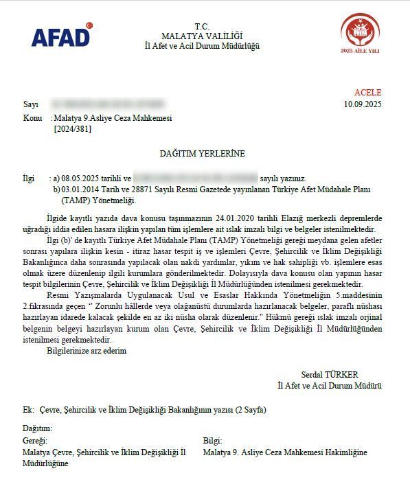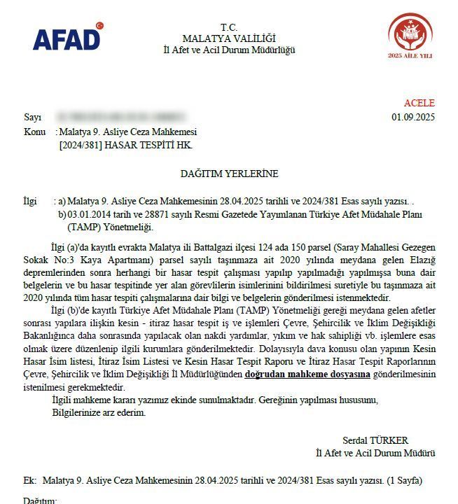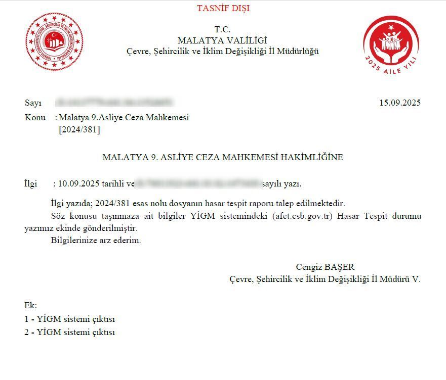 “...kesin ve itiraz hasar tespit çalışmalarının bitirilmesine müteakip askıya çıkılmak suretiyle resmiyet kazanarak, Malatya Çevre, Şehircilik ve İklim Değişikliği İl Müdürlüğünce düzenlenen hasar tespit raporları, Malatya İl Afet ve Acil Durum Müdürlüğü'ne teslim edilmiş olup, Bakanlığımızda (Yapı İşleri Genel Müdürlüğü) ıslak imzalı/resmi herhangi bir belge ve doküman bulunmadığından, talep edilen belge ve dokümanların ilgili Mahkemesine gönderilmesi hususunda, Bilgilerini ve gereğini arz/rica ederim.”