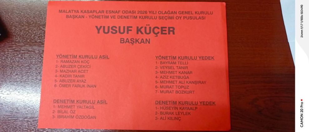 İlçe Seçim Kurulu ve Ticaret Bakanlığı temsilcilerinin gözetiminde tek liste ile gidilen seçimlerde Yusuf Küçer'in başkanlığındaki Malatya Kasaplar Esnaf Odası’nın yönetim ve denetim kadroları şu isimlerden oluştu: