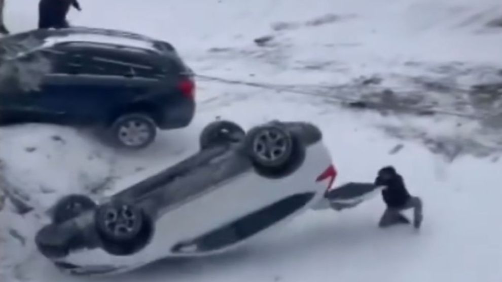 Olayın detaylarına göre, rampa aşağı inen bir otomobil buzlu yolda kayarak yol kenarındaki elektrik direğine çarptı. Sürücü, kaza sonrası aracından inerek durumu kontrol etmek istediği sırada aynı yönden gelen bir cip duramayarak otomobile çarptı. Çarpmanın etkisiyle otomobil ters dönerek yokuş aşağı sürüklendi. Aracının dışında bekleyen sürücü, cipin çarpmasından son anda kurtularak kazayı yara almadan atlattı.