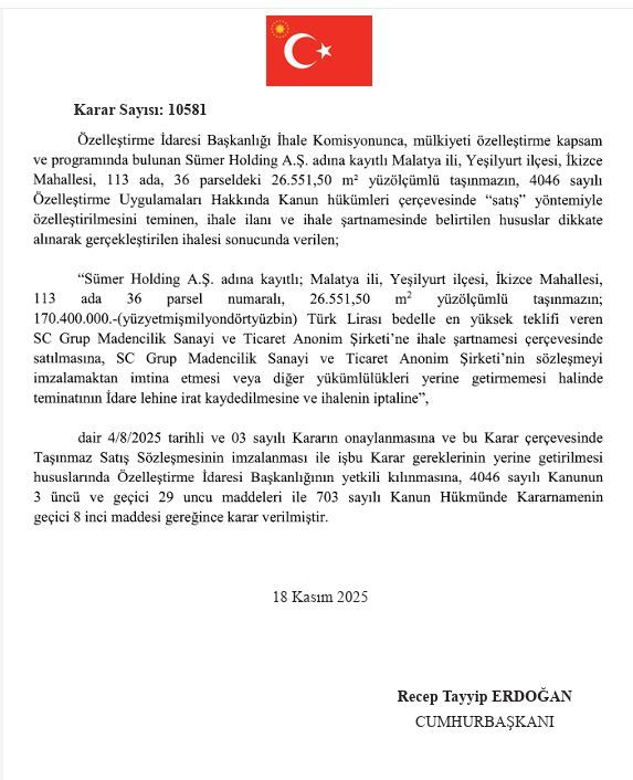 Cumhurbaşkanı Kararı ile Sümer Holding A.Ş.’ye ait Malatya’nın Yeşilyurt ilçesindeki MASKİ binasının çapraz karşısındaki 26.551,50 metrekarelik taşınmazın özelleştirme ihalesi, yükümlülüklerin yerine getirilmemesi nedeniyle iptal edildi. İhalenin iptaline ilişkin karar Resmi Gazete'de yayımlandı.