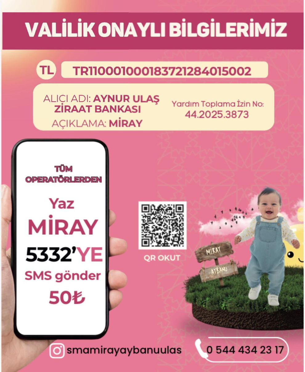 Bağışta bulunmak isteyen hayırseverler için valilik onaylı (İzin No: 44.2025.3873) resmi bilgiler şu şekilde: Ziraat Bankası üzerinden Aynur Ulaş adına açılan TR11 0001 0001 8372 1284 0150 02 IBAN numarası ile açıklama kısmına "MİRAY" yazılarak katkı sağlanabiliniyor. Ayrıca, tüm operatörlerden 5332 numarasına "MİRAY" yazıp kısa mesaj (SMS) göndererek 50 TL tutarında bağış yapılabiliniyor. Aileye doğrudan ulaşmak veya detaylı bilgi almak isteyenler 0 544 434 23 17 numaralı telefondan veya sosyal medyada @smamirayaybanuulas hesabından iletişime geçebiliyor.