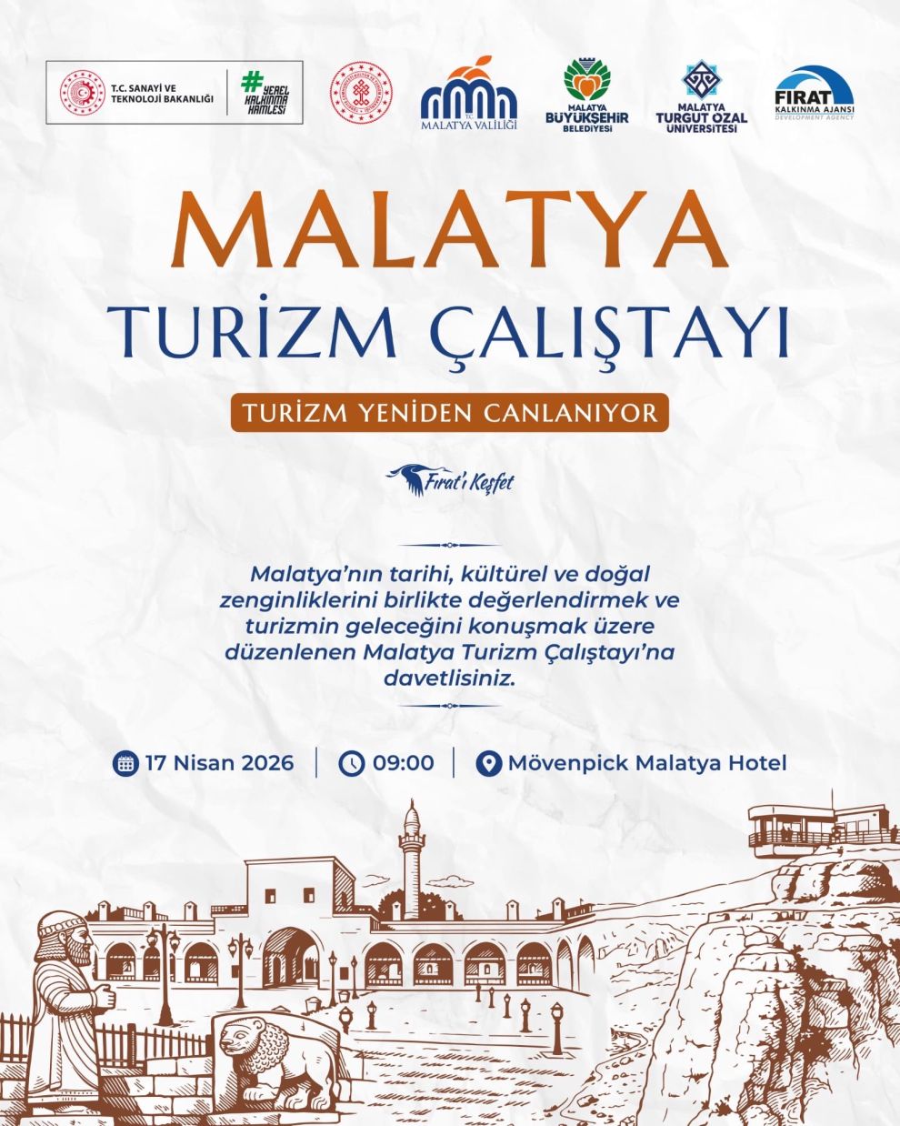 Malatya – Malatya Valiliği koordinesinde, şehrin tarihi ve kültürel mirasını değerlendirmek ve turizm stratejilerini belirlemek amacıyla "Malatya Turizm Çalıştayı" düzenleniyor. "Turizm Yeniden Canlanıyor" temasıyla gerçekleştirilecek olan etkinlik, 17 Nisan 2026 tarihinde sektör paydaşlarını bir araya getirecek.