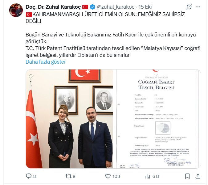 MHP Kahramanmaraş Milletvekili MHP Kahramanmaraş Milletvekili Doç. Dr. Zuhal Karakoç , TBMM’de Bilim, Sanayi ve Teknoloji Bakanı Fatih Kacır ile hatıra fotoğrafı çektirdikten sonra şu açıklamayı yayınladı, “Bugün Sanayi ve Teknoloji Bakanımız Fatih Kacır ile çok önemli bir konuyu görüştük: T.C. Türk Patent Enstitüsü tarafından tescil edilen “Malatya Kayısısı” coğrafi işaret belgesi, yıllardır Elbistan’ı da bu sınırlar içine alıyor. Oysa biz biliyoruz ki; Elbistan kayısısı, Kahramanmaraş’ımızın bereketli topraklarında, Afşin yelinin serinliğinde, Ceyhan suyunun bereketinde yetişir. Rengi daha parlak, kokusu daha yoğun, tadı ise bambaşkadır. Her meyvesinde alın teri, her tanesinde Kahramanmaraşlı çiftçinin emeği vardır. 2024 yılı Elbistan verileri: Üretim Miktarı: 46.390 ton. Toplu Meyvelik Alanı: 109.060 dekar, Verim: 425 kg/dekar Bu kadar güçlü bir üretim kapasitesi ve bu kadar özgün bir aroma varken, Elbistan kayısısının “Malatya Kayısısı” adı altında anılması ne adaletlidir, ne de emeğe saygıdır. Bu, hem üreticimize, hem çiftçimizin alın terine, hem de Kahramanmaraş’ın onuruna gölge düşürür. Biz diyoruz ki: Her şehir kendi değerine sahip çıkmalı, Her emek kendi adıyla anılmalı. Elbistan kayısısı; adıyla, tadıyla, toprağıyla Elbistan’dır, Kahramanmaraş’tır! Bu yanlış tescilin düzeltilmesi için girişimlerimizi başlattık. Çünkü biz Kahramanmaraşlıyız; emeğin, hakkın ve alın terinin yanındayız.”