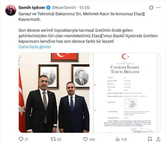 MHP Elazığ Milletvekili Semin Işıkvar, MHP Kahramanmaraş Milletvekili Doç. Dr. Zuhal Karakoç ve Sivas Milletvekili Ahmet Akyürek’in 15 Ekim 2025 günü TBMM’de nöbetçi bakan olan Bilim, Sanayi ve Teknoloji Bakanı Fatih Kacır’ı ayak üstü ziyaret edip fotoğraf vererek, Malatya Kayısısı ile ilgili açıklamalarda bulundukları görüldü.