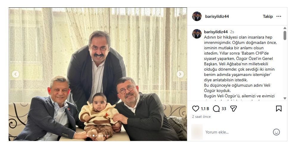 “Adının bir hikâyesi olan insanlara hep imrenmişimdir. Oğlum doğmadan önce, isminin mutlaka bir anlamı olsun istedim. Yıllar sonra ‘Babam CHP’de siyaset yaparken, Özgür Özel’in Genel Başkan, Veli Ağbaba’nın milletvekili olduğu dönemde; çok sevdiği iki ismin benim adımda yaşamasını istemişler’ diye anlatabilsin istedik. Bu düşünceyle oğlumuzun adını Veli Özgür koyduk. Bugün Veli Özgür’ü, ailemizi ve evimizi ziyaret ederek bizleri onurlandıran Cumhuriyet Halk Partisi Genel Başkanımız Sayın Özgür Özel’e ve Milletvekilimiz Sayın Veli Ağbaba’ya yürekten teşekkür ediyorum.”