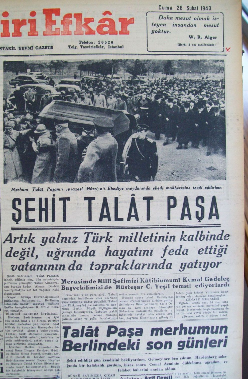 Malatya - Almanya'da Berlin’de 15 Mart 1921 yılında uğradığı suikast sonucu şehit düşen Osmanlı Devleti’nin son dönemi sadrazamlarından Talat Paşa’nın cenazesi, 22 yıl aradan sonra Türkiye’ye nakledilmişti,. Dönemin hükümetleri arasında yürütülen diplomatik temaslar neticesinde getirilen naaş, Sirkeci Garı’ndaki resmi törenin ardından Hürriyet-i Ebediye Tepesi’ne defnedilmişti.