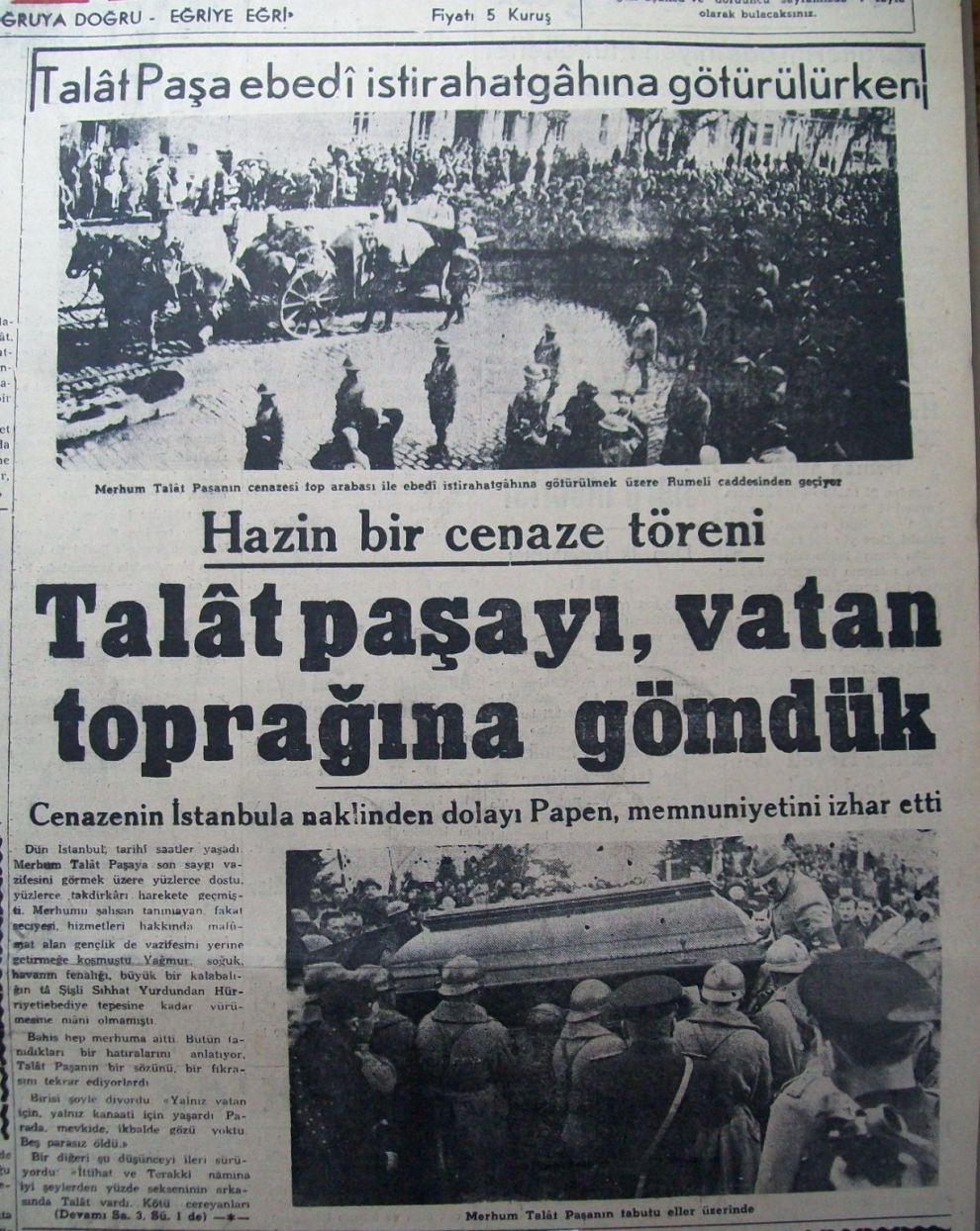 Öğleden sonra saat 14.00’te başlayan ikinci merasimle Talat Paşa’nın naaşı, devlet töreni eşliğinde Hürriyet-i Ebediye Tepesi’ne götürüldü. Burada dualar eşliğinde vatan toprağına emanet edilen Paşa’nın cenazenin Türkiye’ye getirilmesi ve düzenlenen törenler dönemin hükümeti tarafnıdan desteklendi.