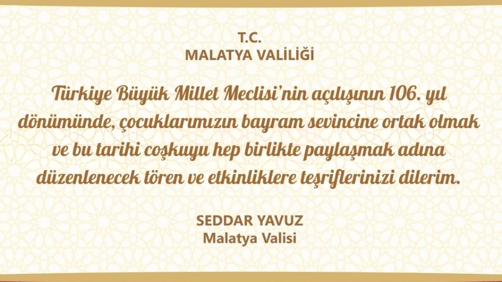 "Türkiye Büyük Millet Meclisi'nin açılışının 106. yıl dönümünde, çocuklarımızın bayram sevincine ortak olmak ve bu tarihi coşkuya hep birlikte paylaşmak adına düzenlenecek tören ve etkinliklere teşriflerinizi dilerim."