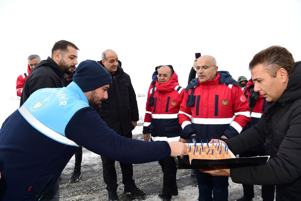 Başkan Er, Yol Yapım, Bakım ve Onarım Dairesindeki kar mücadelesi yapan personeleri ziyaret ederek, "Geceyi gündüze katan, sadece karlı yolları değil gönüllere giden yolları da açan Yol Yapım, Bakım ve Onarım Dairesi Başkanlığımızda çalışan fedakâr mesai arkadaşlarımızı ziyaret ettik. Bu şehrin her metrekaresinde emeği, alınteri olan tüm ekiplerimize yürekten teşekkür ediyorum. Ayağınıza taş, yüreğinize gam değmesin." dedi.